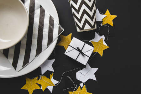 festive decoration of the table for the birthday or christmas party. stylish decorations on a black background, a garland garlands, glasses, gifts. free space for text