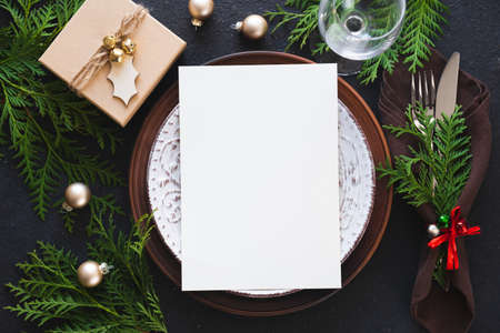 Christmas table setting. Background for writing Christmas or New Year Menu.