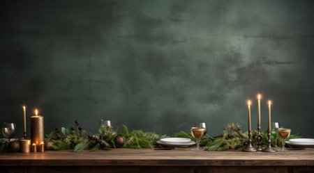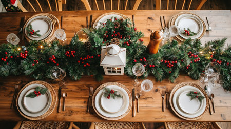 Elegant Christmas dining setup featuring a rustic wooden table adorned with festive evergreen garland and berry decorations, creating a warm holiday ambiance perfect for seasonal gatherings.