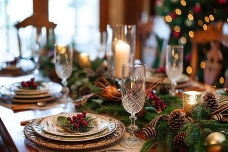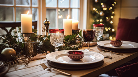Elegant Christmas dinner table setting with crystal glasses, pine garland, golden candles and ornaments. Softly lit tree creates magical bokeh background in sophisticated dining room.