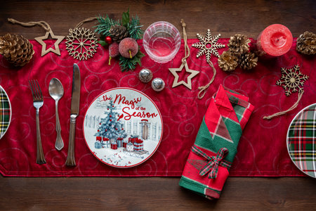A cozy Christmas dinner table with a rustic wooden tabletop is decorated with pine cones, holly, and plaid napkins, creating a warm