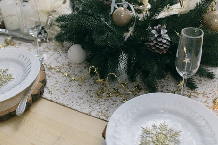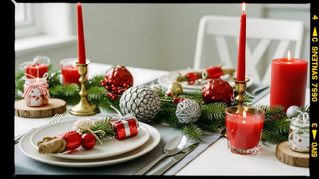 New year table decor. Christmas table with candles, plates and decorations.