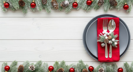 A beautifully set Christmas table with a plate, cutlery, and a festive napkin adorned with pine sprigs and baubles, framed by a garland of fir branches and red ornaments on a white wooden background.