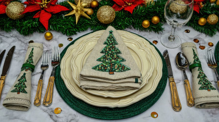 A beautiful Christmas table setting featuring green and cream plates, a napkin folded into a Christmas tree, and elegant cutlery on a marble surface with festive decorations.