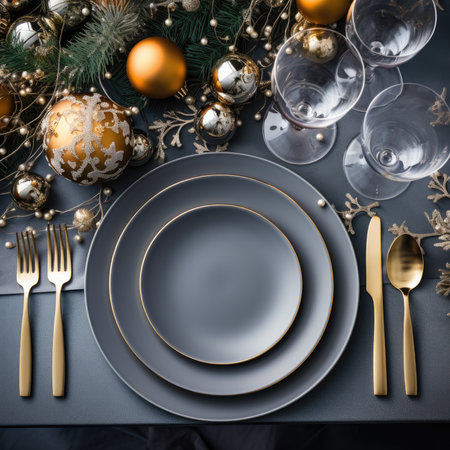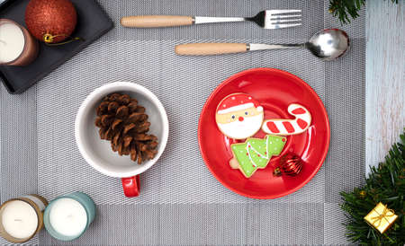 Beautiful Christmas table setting with decorations. Preparation for christmas dinner. Top view