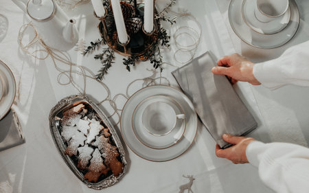 Woman hand setting up table for Christmas dinner. Table is decorated with white tablecloth, cups, ginger bread cookies, candlestick, table napkin and small wooden decorative houses