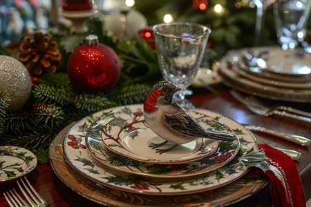 Elegant christmas table setting with festive bird ornament and holiday decor.