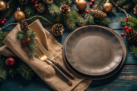 Table setting. Vintage. Stylish plates, napkin, Christmas tree branches and Christmas decorations on a wooden background. The concept of a Merry Christmas and New Year 2025.