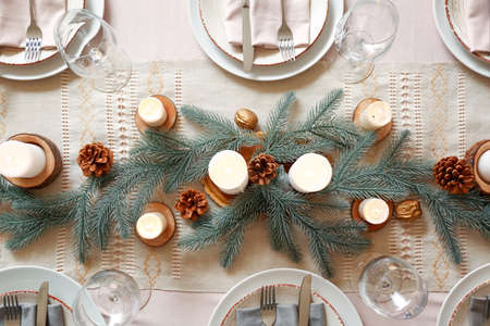 Beautiful Christmas table setting with candles, fir branches and christmas decorations