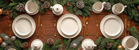 Table served for Christmas dinner, top view. AI generative
