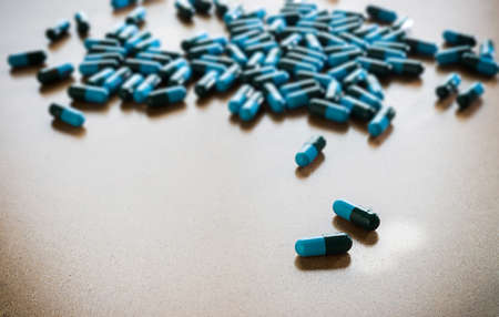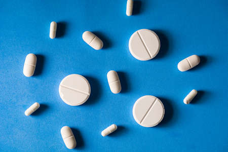 Close up of many different pills on blue background.