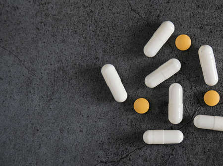 White and orange pills on a dark concrete table