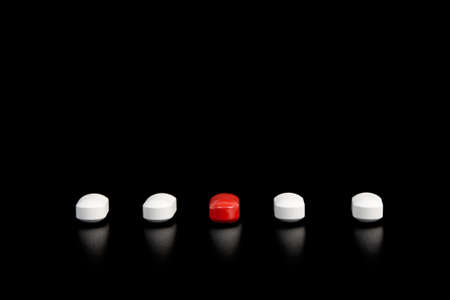 Five pills in red and white on a black background.