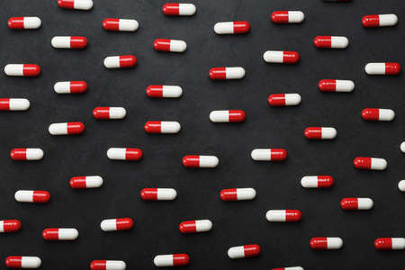 A pattern of red and white pills of medical pills on a black background. Top view, as a full-screen texture background.