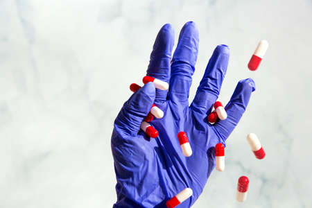 A hand with blue latex gloves grabbing hand full of medicines, Capsules for Vitamines,drugs,medication. Health,business concept