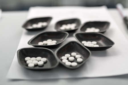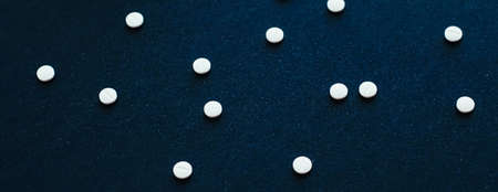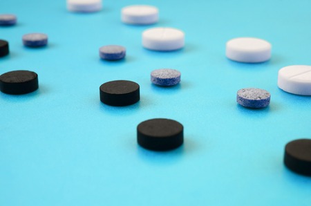 A lot of white, black and grey tablets lie on the blue surface. Background image on medical and pharmaceutical topics