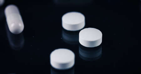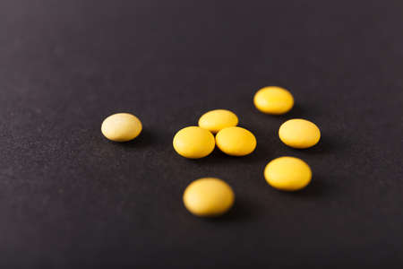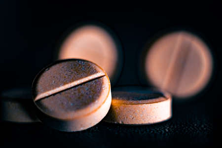 Pills close up on black background. Concept of medical