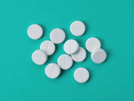 Heap of white round medical pills on blue