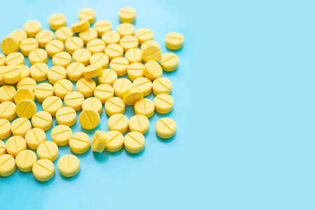 Yellow tablets of Paracetamol on blue background. Copy space