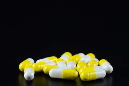 Capsules and tablets of white and yellow color, a jar. Black background. Health concept