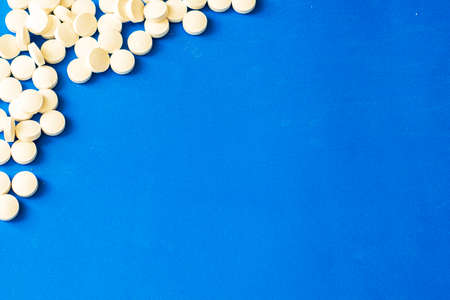Round white, yellow pills on a blue background top view, side view in macro. Place for text. The tablets lie chaotically on the right, on the left in the middle. Pills in macro