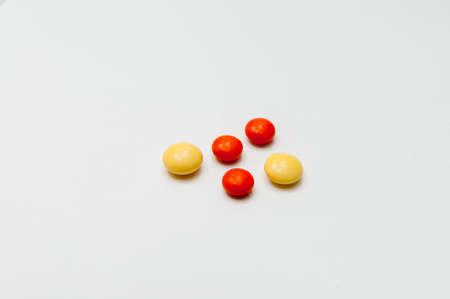 Red and yellow candies isolated on white background. Top view.