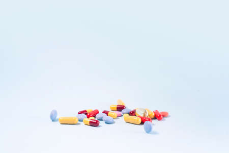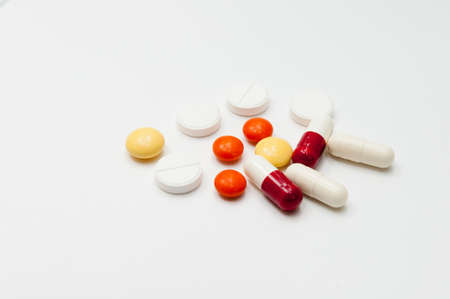 Multiple color drug and pills isolated on white background.