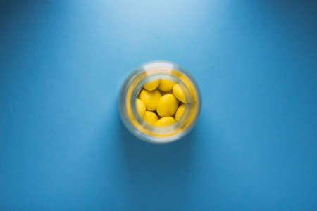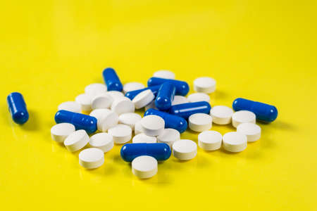 medicines and pills blue and white color on yellow background