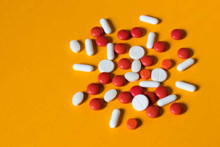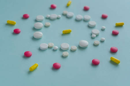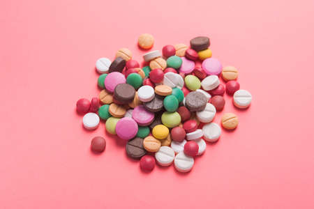 colorful pills and tablets on background.