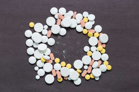Different tablets, pills, medications drugs macro photo. Medicine, sickness