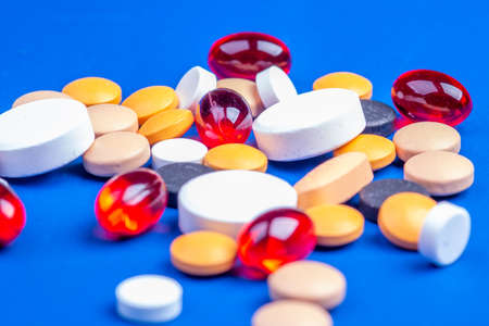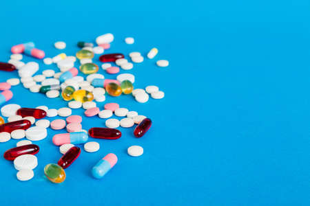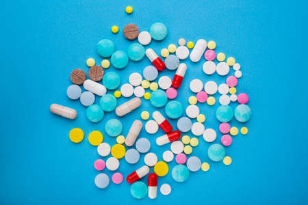 A lot of multicolored pills and capsules on a blue background as a concept of addiction from medicine. Vitamins to keep immunity on a high level.