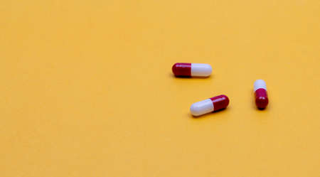 Red-white antibiotic capsule pills on yellow background. Prescription drug. Antibiotic drug resistance concept. Pharmaceutical industry. Pharmaceutics. Pharmacy product. Pharmacy drugstore banner.