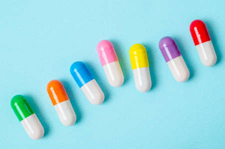 Many colorful pills capsules on blue background.