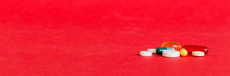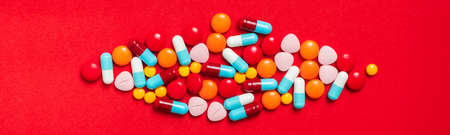 A lot of pill on the red background. Medicine pills, tablets and capsules.