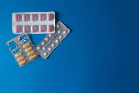 Three different blisters on blue background with copy space. High quality photo