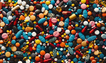 A diverse collection of colorful pills and capsules closely packed together. Generate AI