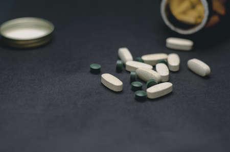 white and green pills on black background, dark tone