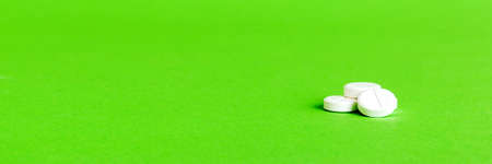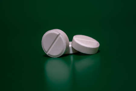 White pills on a green background. medical theme. selective focus. Side view of a pile of tablets.