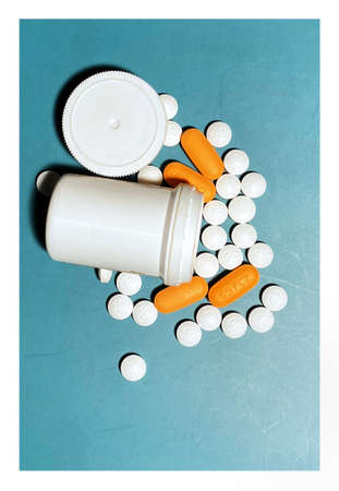 Several types of pills, such as antibiotics, anti-inflammatories. All on blue background