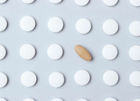 Herbal pill among white chemical pills. Your choice. Background of the group of pills. Medical concept