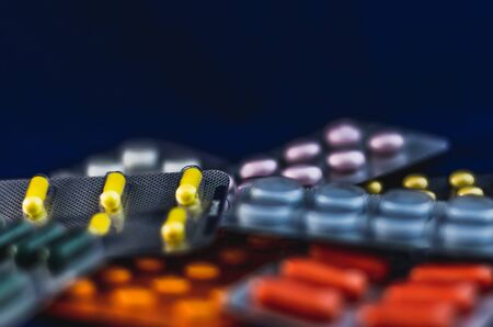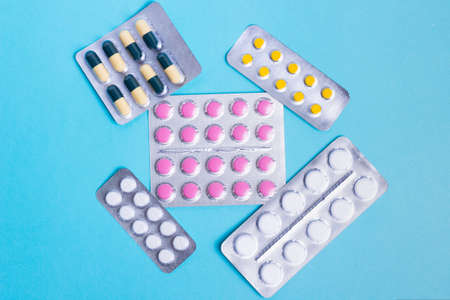 Different medicines: tablets, pills in blister pack, medications drugs on blue background. Close-up photo, copy space. High quality photo