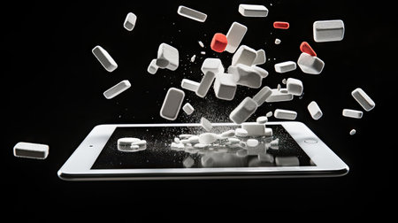 Tablet pc with falling white and red pills isolated on black background