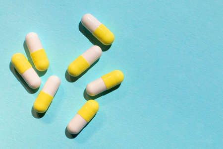 Yellow white capsules pills with hard shadows on a gentle blue paper background. Closeup, top view. Place for text.