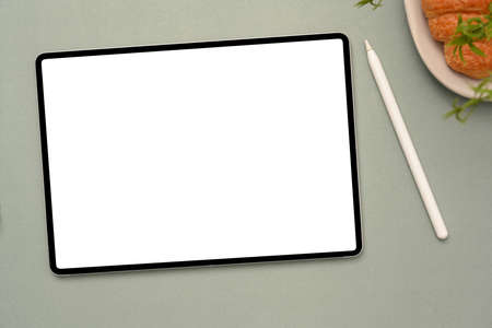 Overhead shot, Simple workspace with tablet touchpad white screen mockup, stylus pen and croissant on grey background.