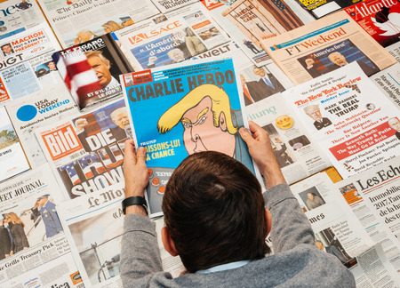 PARIS, FRANCE - JAN 21, 2017: Man holding Charlie Hebdo with Trump caricature above major international newspaper journalism featuring headlines with Donald Trump inauguration as the 45th President of the United States in Washington, D.C