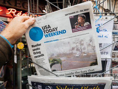PARIS, FRANCE - SEP 23, 2017: Man buying latest newspaper USA TODAY with Hurricane Maria breaking news and picture of damages wind sea water