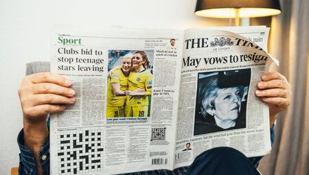 Paris, France - 29 Mar 2019: hide face of senior man reading in living room latest british The Times newspaper UK press featuring Theresa may PM on front cover wows to resign