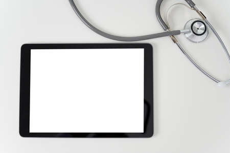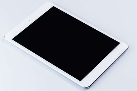 Tablet computer on grey stone background. Isolated white screen with copy space. Empty space for text. Empty blank screen.