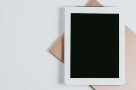 Tablet computer and notebooks on a light background. Top view