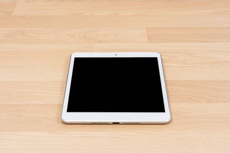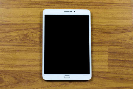 White digital tablet on wooden table background